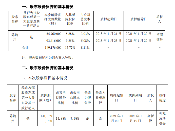 公告指出股東股份累計(jì)質(zhì)押情況說明