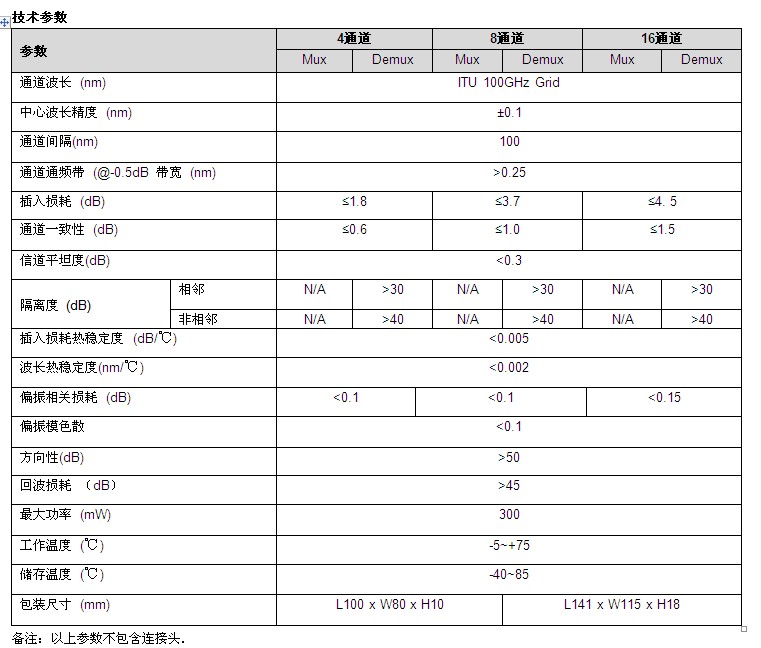 密集波分復(fù)用器是將不同波長(zhǎng)的光信號(hào)復(fù)用至一根光纖上(復(fù)用),或?qū)?fù)用在一根光纖中的多個(gè)光信道按波長(zhǎng)分開(解復(fù)用).100G信道間隔密集光波分復(fù)用器/解復(fù)用器采用成熟的多腔介質(zhì)膜實(shí)現(xiàn)光的濾波,波長(zhǎng)穩(wěn)定性好,采用密封工藝封裝,環(huán)境穩(wěn)定性高.