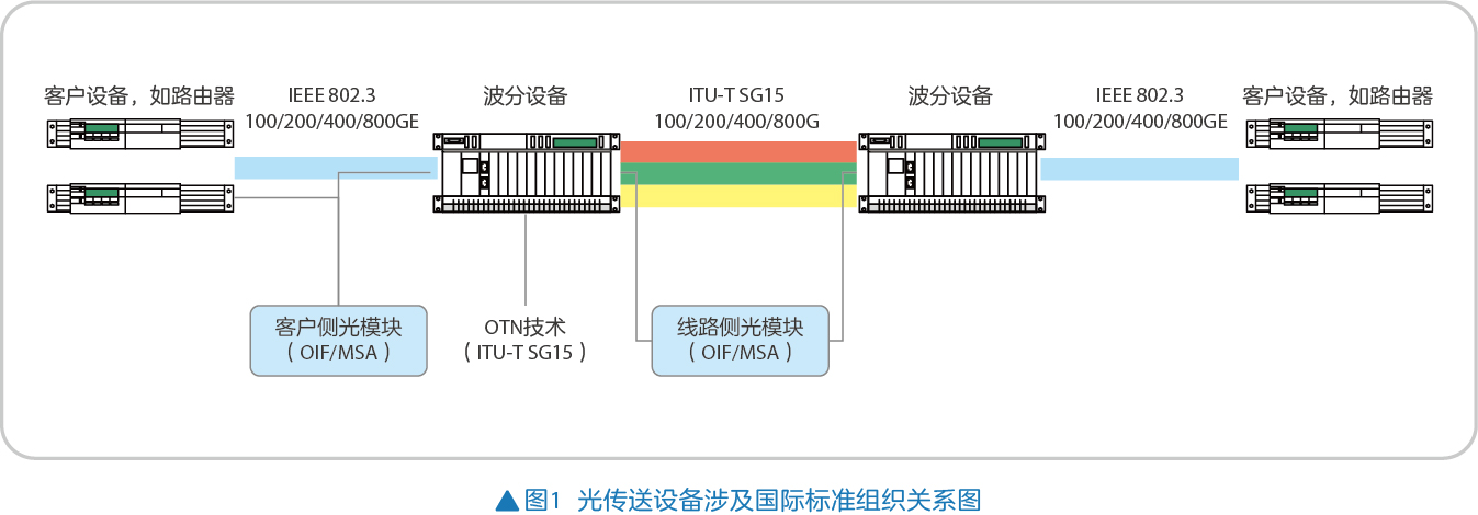 光傳送技術(shù)涉及的國(guó)際標(biāo)準(zhǔn)組織主要包括ITU-T SG15、OIF、IEEE802.3以及各類MSA(multi source agreement),各國(guó)際標(biāo)準(zhǔn)組織的分工及與光傳送設(shè)備對(duì)應(yīng)關(guān)系如圖1所示。