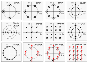 多維度、多進制調(diào)制技術(shù)可在一個符號上承載多個比特信息,能夠有效提高頻譜效率,降低符號發(fā)送的波特率,減小基帶帶寬及與之相關(guān)的色度色散和偏振模色散,減小對傳輸通道和光電器件帶寬的要求。