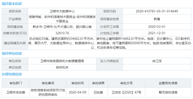 ICCSZ訊 近日,據(jù)河南省投資項(xiàng)目在線審批監(jiān)管平臺消息,新鄉(xiāng)衛(wèi)輝市大數(shù)據(jù)中心審批結(jié)果顯示“已批復(fù)”。該項(xiàng)目估算總投資32810.76萬元,位于新鄉(xiāng)市-衛(wèi)輝市-比干大道以東、振興路以南,總占地約35畝,建筑總面積約34462.61平方米,其中地上建筑面積14462.61平方米。包括:云計(jì)算中心、IDC數(shù)字機(jī)房、展示大廳、大數(shù)據(jù)應(yīng)用中心、數(shù)據(jù)儲存中心、其他配套;地下建筑面積20000平方米。包括:地庫面積、會議室及辦公、機(jī)動車停車位等設(shè)施,計(jì)劃2021年12月完工。