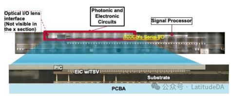 共封裝的關鍵技術之一是實現超高密度電-光 I/O 引腳配準。博通的 SCIP(Silicon Chiplet Photonics Package)技術利用 TSV 和高密度鍵合,實現硅基光電子chip 和 ASIC chip 在 130um 引腳距下對準(圖 1)[1]。高密度短距(<150 um)線路實現了每比特能量效率低于 1pJ,比現有技術提高 10 倍。博通實現高密度三維堆疊芯片級封裝,采用晶圓鍵合的加工過的 ASIC 和光子晶圓 (圖 2)[1]。實現穩(wěn)定的對準和鍵合以及晶圓薄化(75 um)、TSV 開槽均勻性和隱形切割等技術對高密度集成至關重要。隨后基板上順序共封裝鍵合的芯片/光學引擎和 ASIC 利用焊膏回流和精確的底部充填來實現。