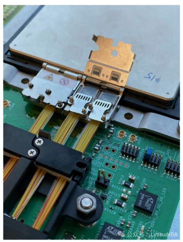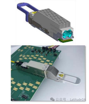 由于硅基光電子無法一體化集成激光器,因此需要使用遠端激光模塊(RLM)提供光源[1]。博通設計實現熱插拔 RLM,遵循 QSFP-DD 標準,單通道提供高達 21dBm 的光功率并實現安全鎖定(圖 3)[1]。RLM 實現與光引擎的連接器盲配對,方便維護更換。