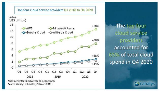 Canalys的數(shù)據(jù)顯示,排名第四的是阿里巴巴的云計算業(yè)務(wù)阿里云,它在全球云服務(wù)市場的份額為6%,它在2020年第四季度增長54%。