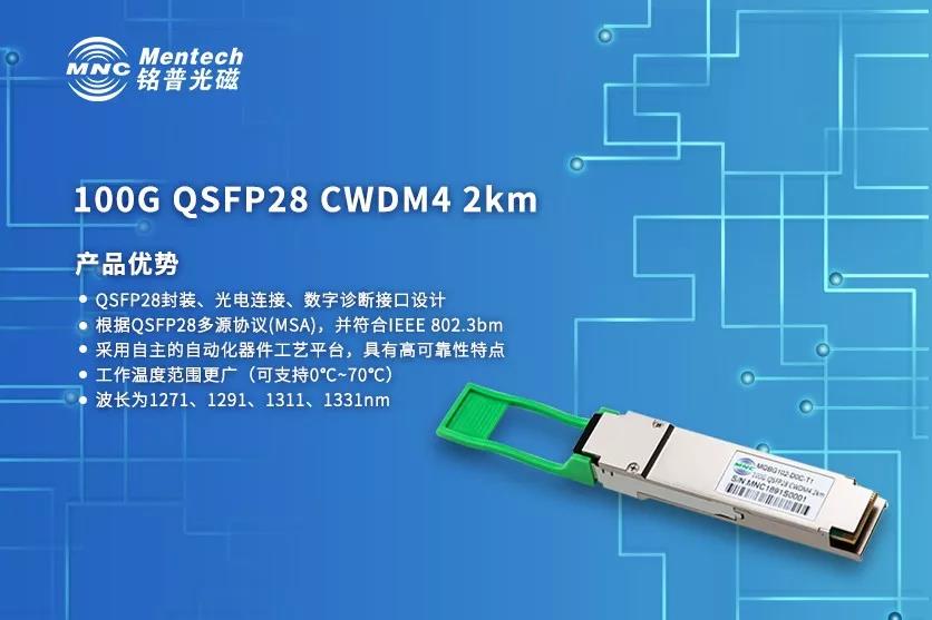 銘普光磁的100G QSFP28 CWDM4將四個(gè)發(fā)射器和接收器集成到一個(gè)模塊中。在發(fā)射機(jī)端,通過集成的光學(xué)多路復(fù)用器將四個(gè)波長合成在一起。在接收端,光數(shù)據(jù)通道的用集成光學(xué)解復(fù)用器進(jìn)行解復(fù)用。每個(gè)數(shù)據(jù)通道集成光電探測器和跨阻抗放大器,CDR。