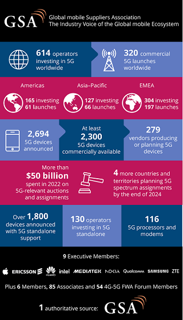 ICC訊(編譯:Nina)根據(jù)GSA(全球移動(dòng)供應(yīng)商協(xié)會(huì))在2024年6月10日發(fā)布的最新統(tǒng)計(jì)數(shù)據(jù),GSA已確定全球614家運(yùn)營(yíng)商(3月底時(shí)為585家)在投資5G,投資方式包括試驗(yàn)、獲取許可證、規(guī)劃、部署網(wǎng)絡(luò)和商用。5G商用方面,320家運(yùn)營(yíng)商(3月底時(shí)為310家)已經(jīng)推出或試運(yùn)行了至少一項(xiàng)符合3GPP標(biāo)準(zhǔn)的5G服務(wù)。即在投資5G的運(yùn)營(yíng)商中,52.12%的運(yùn)營(yíng)商已經(jīng)實(shí)現(xiàn)商用。