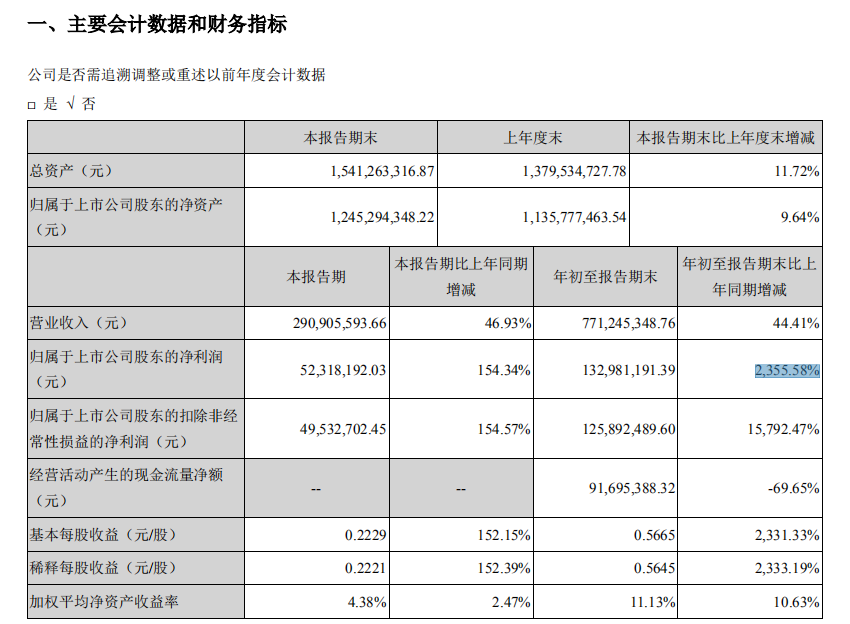 ICCSZ訊 10月29日,成都新易盛通信技術(shù)股份有限公司(證券代碼:300502)公布了2019年第三季度報(bào)告。報(bào)告顯示,新易盛報(bào)告期內(nèi)營(yíng)業(yè)收入為2.9億元,同比增長(zhǎng)46.93%;歸屬上市公司股東的凈利潤(rùn)為0.52億元,同比增長(zhǎng)154.34%。2019年1-9月?tīng)I(yíng)業(yè)收入為7.71億元,同比上年增長(zhǎng)44.41%;歸屬上市公司股東凈利潤(rùn)為1.33億元,同比增長(zhǎng)2355.58%。