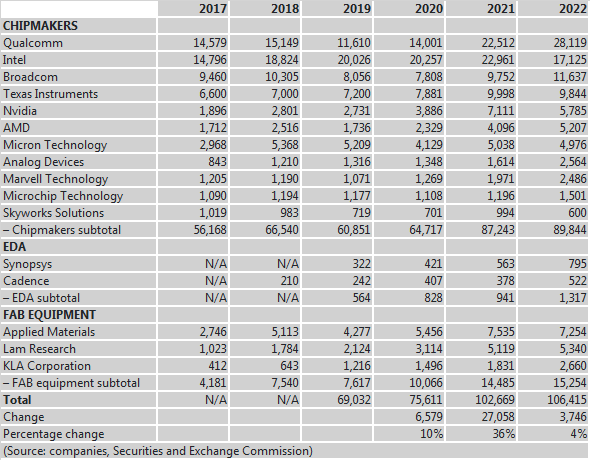 ICC訊(編譯:Nina)對(duì)于美國(guó)芯片制造商來(lái)說(shuō),一個(gè)擁有14億人口的技術(shù)饑渴市場(chǎng),加上缺乏本土專(zhuān)業(yè)知識(shí),一直是一個(gè)有利可圖的目標(biāo)。包括生產(chǎn)芯片制造工具和軟件的公司在內(nèi)的一些最大的公司在2021財(cái)年對(duì)中國(guó)的銷(xiāo)售額飆升36%,達(dá)到近1030億美元。Light Reading最新統(tǒng)計(jì)數(shù)據(jù)顯示,盡管美國(guó)試圖切斷中國(guó)與美國(guó)科技的聯(lián)系,但2022年這些公司對(duì)中國(guó)的銷(xiāo)售額又增長(zhǎng)了4%。