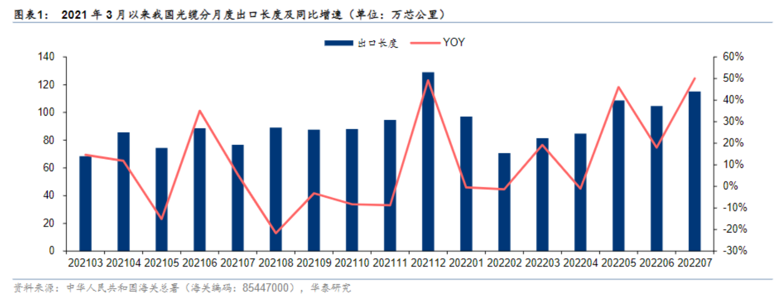 根據CRU數據,海外光纜市場占比有望超50%。中信證券分析師黃亞元9月6日發(fā)布的研報指出,今年1-7月我國相關光纖光纜產品(統(tǒng)計口徑:光纖、光纖束及光纜,但品目8544的貨品除外)出口額同比提高136%。華泰證券分析師余熠8月28日發(fā)布的研報指出,海外固網建設需求旺盛,22年以來,我國光纜出口量持續(xù)穩(wěn)步提升,特別在5、6、7三月均實現超過100萬公里的光纜出口,7月實現50.11%的同比增長。