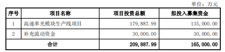 根據(jù)募集說(shuō)明書(shū)顯示,項(xiàng)目擬募集16.5億元,其中13.5億元用于投入高速率光模塊生產(chǎn)線項(xiàng)目,3億元用于補(bǔ)充流動(dòng)資金。公告預(yù)計(jì)高速率光模塊項(xiàng)目總投資18億元,其中本次非公開(kāi)發(fā)行股票募集資金擬投入13.5億元,不足部分將由公司通過(guò)自籌方式解決。