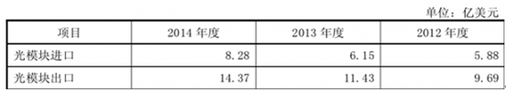 隨著我國(guó)在全球光模塊行業(yè)的地位不斷提高,我國(guó)光模塊企業(yè)出口持續(xù)增長(zhǎng),行業(yè)的市場(chǎng)空間不斷擴(kuò)大,13年、14年整體我國(guó)光模塊行業(yè)進(jìn)出口情況如下: