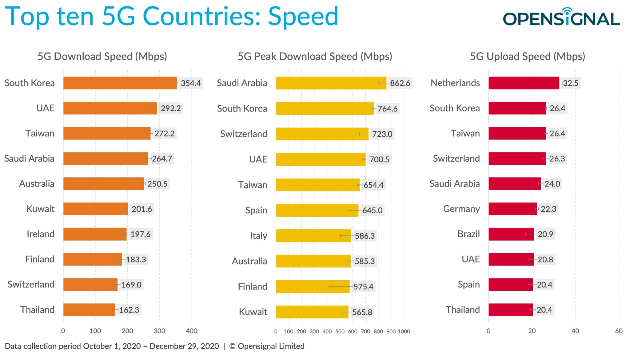 韓國用戶以354.4Mbps的下載速度在5G下載速度上領(lǐng)先世界。荷蘭以32.5 Mbps的速度位居5G上傳速度榜首。