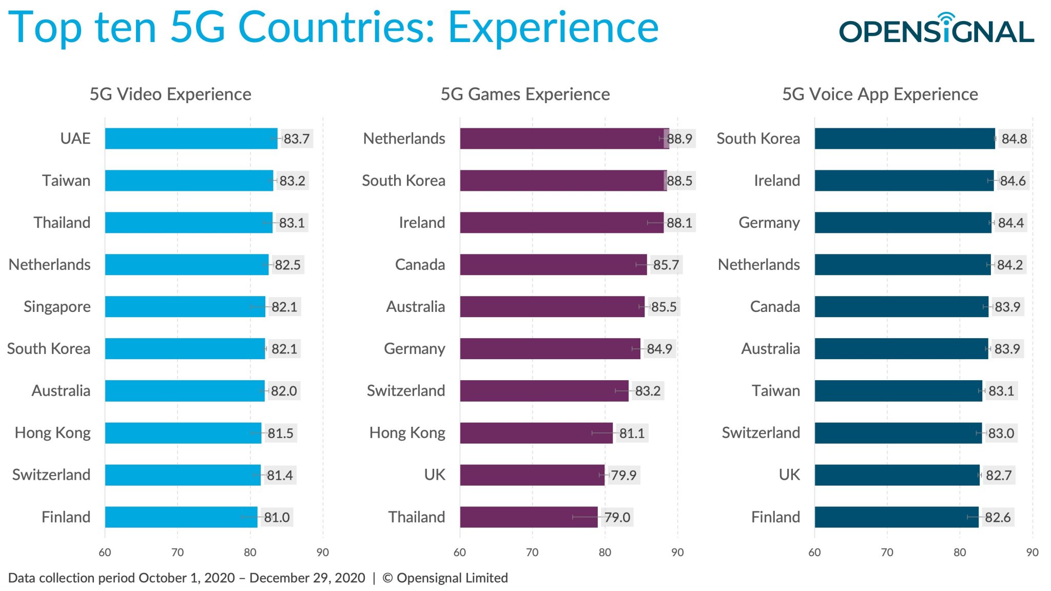 運營商希望說服游戲玩家升級到5G,多人手機游戲業(yè)的期望一直非常高。但隨著越來越多的運營商部署5G核心網(wǎng)絡(luò)和獨立5G,這將是一個值得關(guān)注的領(lǐng)域。相比之下,在5G視頻體驗排名前十的所有國家和地區(qū)得分都超過80分,體驗“極好”。