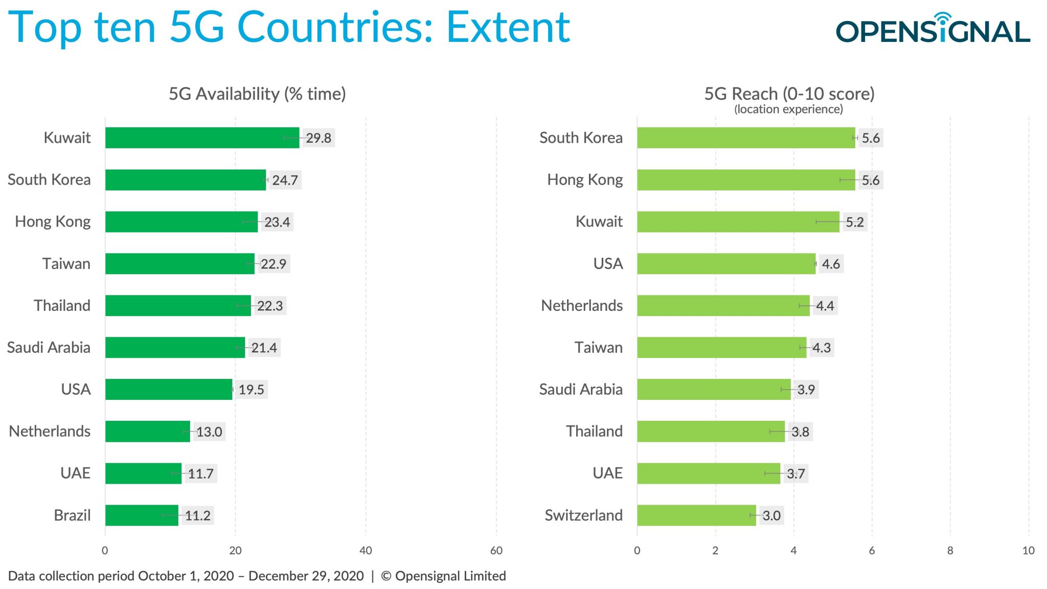 Opensignal還考察各國5G可用性和覆蓋率,以衡量用戶的真實體驗。