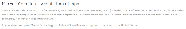 2021年4月16日,Marvell宣布其99%的股東投票贊成擬議收購Inphi。表決還批準了將合并公司的總部設在美國特拉華州。在投票前舉行的另一次會議中,Inphi的股東也投票同意與Marvell合并。