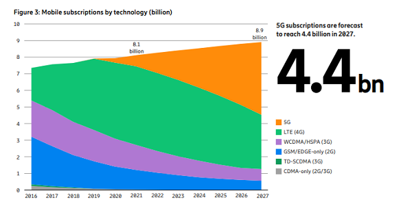在愛立信移動報告十周年紀念版中,這家瑞典設(shè)備商現(xiàn)在預(yù)測到2021年底,全球5G用戶將超過6.6億,到2027年底,全球5G用戶預(yù)計將達到44億。