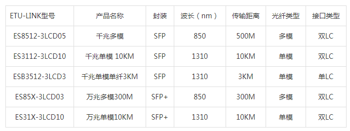 ETU-LINK型號產(chǎn)品名稱封裝波長(nm)傳輸距離光纖類型接口類型