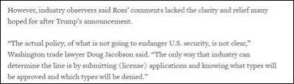 但從英國路透社的報道來看,不少美國企業(yè)和業(yè)內(nèi)觀察人士仍對美國商務(wù)部的這一最新表態(tài)持觀望態(tài)度,因為美國商務(wù)部并沒有明確地表示什么樣的交易才不會對美國的國家安全構(gòu)成威脅。