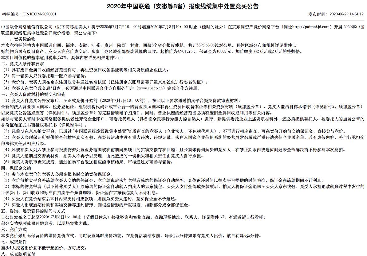 ICC訊 中國(guó)聯(lián)通宣布將于2020年7月7日10:00時(shí)起至2020年7月8日10:00 時(shí)止(延時(shí)的除外)在京東網(wǎng)資產(chǎn)競(jìng)價(jià)網(wǎng)絡(luò)平臺(tái)開(kāi)展2020年中國(guó)聯(lián)通報(bào)廢線(xiàn)纜集中處置公開(kāi)競(jìng)價(jià)活動(dòng)。