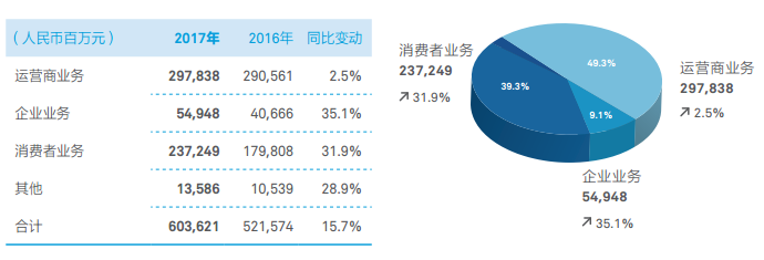 2017年,運(yùn)營商業(yè)務(wù)實(shí)現(xiàn)銷售收入人民幣297,838百 萬元,同比增長2.5%。在市場投資周期波動影響的大 背景下,我們攜手合作伙伴與客戶一起把握網(wǎng)絡(luò)建設(shè)從 “投資驅(qū)動”向“價值驅(qū)動”轉(zhuǎn)變的趨勢,助力運(yùn)營商實(shí) 現(xiàn)新增長。