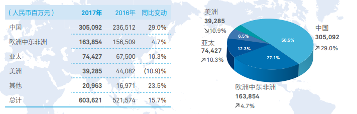 按地區(qū)來看,中國市場受益于運(yùn)營商4G網(wǎng)絡(luò)建設(shè)、智能手機(jī)持續(xù) 增長以及企業(yè)行業(yè)解決方案能力的增強(qiáng),實(shí)現(xiàn)銷售收入人民幣3050.92億元,同比增長29.0%;
