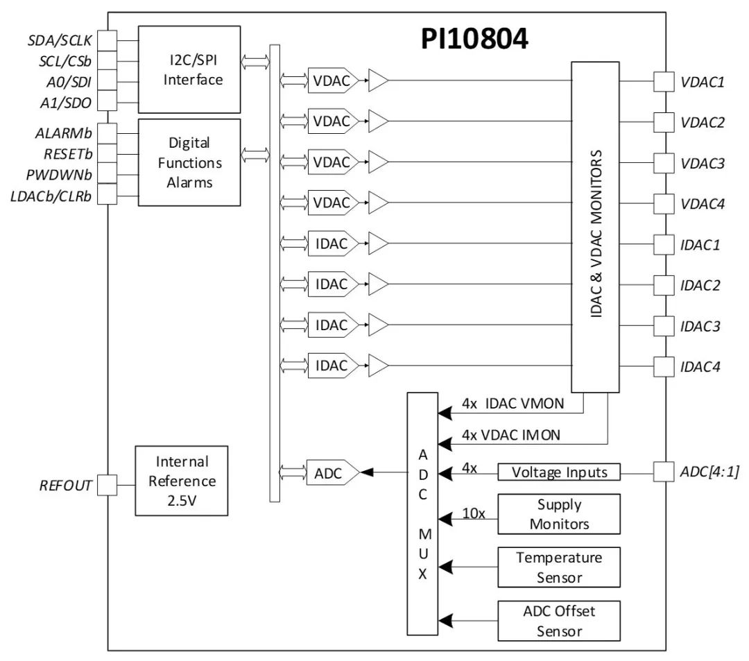 PI10804針對(duì)4路電吸收調(diào)制激光器的監(jiān)控功能而優(yōu)化設(shè)計(jì), PI10804包含電流型DAC(IDAC),電壓型DAC(VDAC),多通道輸入ADC, 內(nèi)部參考電壓,串行通信接口以及錯(cuò)誤告警和關(guān)斷功能。
