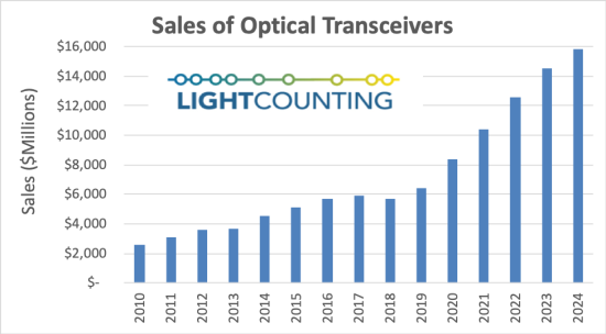 如果DWDM模塊的商用市場包括所有端口,2020年100G+相干模塊的銷售額將從8.1億美元上升至35億美元。