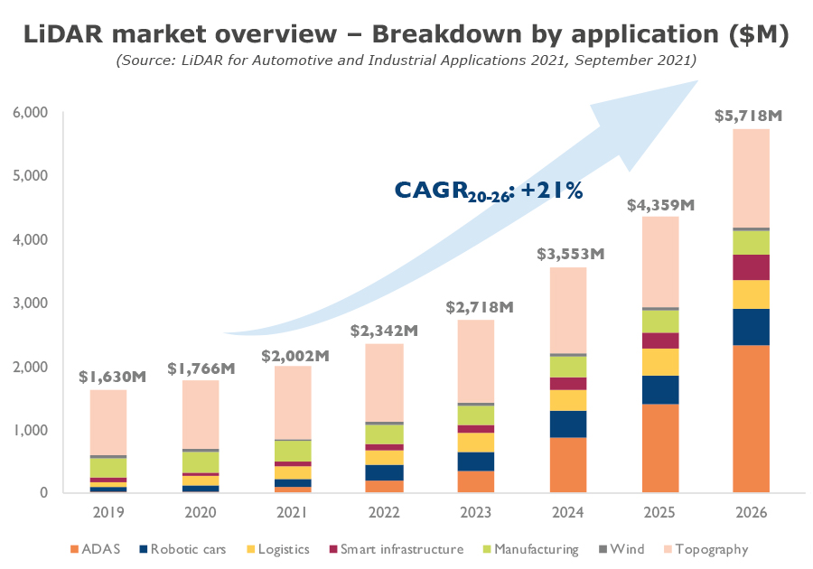 2020年,高級駕駛輔助系統(tǒng)(ADAS)板塊激光雷達(dá)僅占整個汽車和工業(yè)應(yīng)用激光雷達(dá)市場的1.5%。但到2026年,ADAS板塊占比將上漲至41%,CAGR達(dá)到111%,市場規(guī)模將達(dá)23億美元。另外,包含機(jī)器人出租車和自動汽車在內(nèi)的智能駕駛汽車板塊的增長則令人失望,但其依然重要,該板塊的市場規(guī)模將以33%年復(fù)合增長率在2026年達(dá)到5.75億美元。