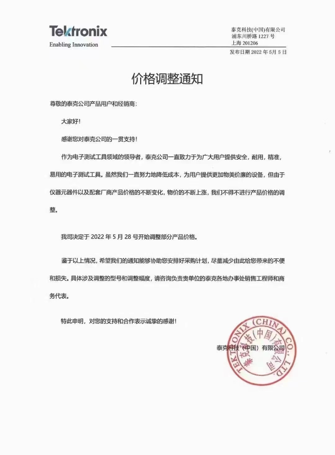 ICC訊 近日,電子測試工具提供商泰克公司發(fā)布漲價通知稱,公司決定于2022年5月28號開始調(diào)整部分產(chǎn)品價格。