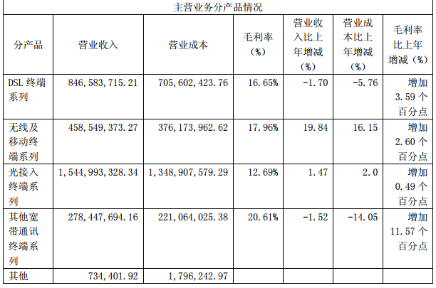 分產(chǎn)品收入情況看,光接入終端系列營(yíng)收15.45億元,同比增長(zhǎng)1.47%,毛利率12.69%,;因需求下降,導(dǎo)致DSL終端系列營(yíng)收8.47億元,同比下降1.70%,但毛利率為16.65%,相比同期提升了3.59%。其他系列如無線及移動(dòng)終端系列營(yíng)收4.59億元。