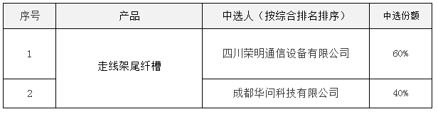 ICC訊(編輯:Anton)中國電信股份有限公司內(nèi)江分公司發(fā)布2021-2022年走線架尾纖槽采購服務(wù)項目中選人公示。中選人為四川榮明通信設(shè)備有限公司和成都華問科技有限公司,中選份額分別為60%和40%。