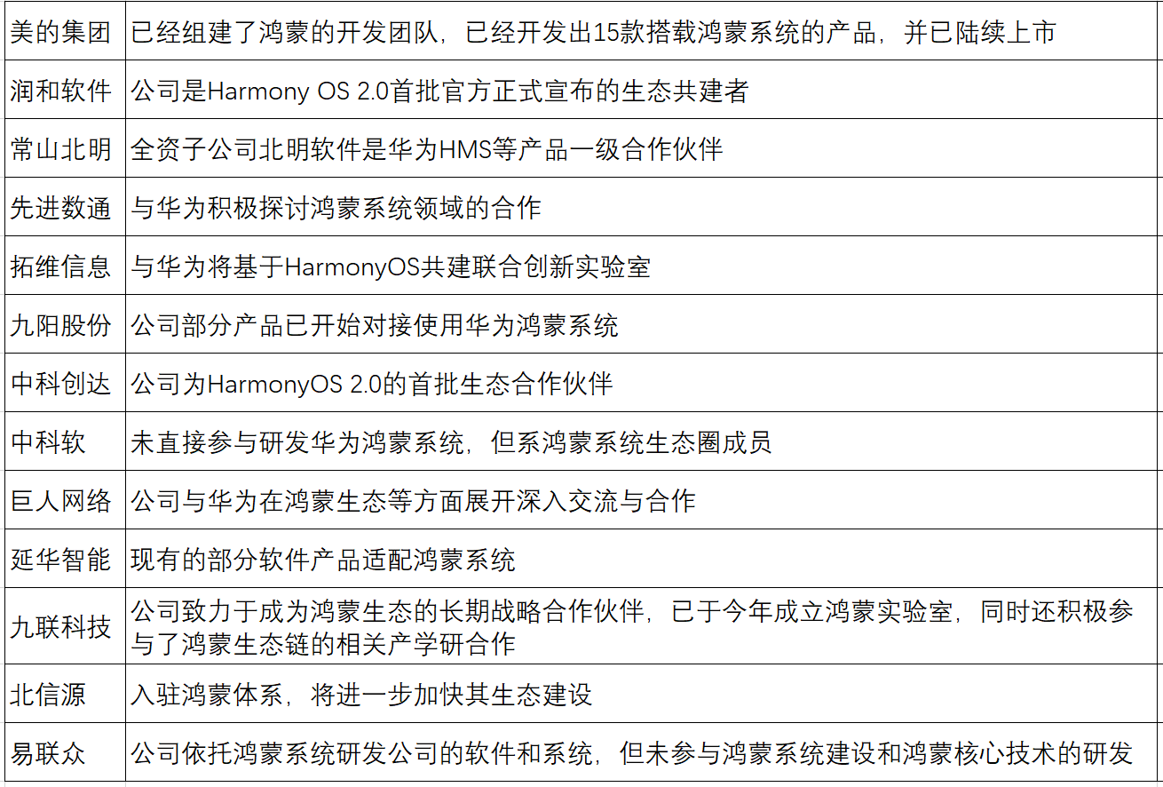 目前華為鴻蒙生態(tài)合作伙伴包括美的集團、潤和軟件、九陽股份等企業(yè),開發(fā)了眾多創(chuàng)新鴻蒙生態(tài)產品,涉及智能家居設備、智能運動健康設備、智能辦公設備等。從目前來看,接入鴻蒙操作系統(tǒng)的企業(yè)還是以小廠商為主。