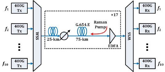 綜合優(yōu)化首先通過擴展單載波信號的波特率至約90GBd,聯(lián)合概率整形技術(shù)可降低等效調(diào)制階數(shù),實現(xiàn)約2-3dB的收發(fā)機背靠背性能提升;同時結(jié)合超奈奎斯特濾波和碼間串擾補償算法,保證適配100GHz通道間隔,提升傳輸總體頻譜效率;進一步引入超低損耗超大有效模場面積G.654.E光纖替代G.652.D光纖,獲取末端OSNR的增益及全鏈路非線性效應(yīng)的抑制;最后采用基于EDFA+拉曼的混合放大器,實現(xiàn)了約2.5dB的放大器噪聲抑制。通過聯(lián)合使用上述多種技術(shù)優(yōu)化手段,最終實現(xiàn)了在超長距1700km G.654.E光纖鏈路上傳送10路400G超高速OTN信號。