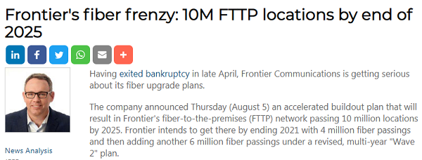 ICC訊(編譯:Nina)據(jù)外媒Light Reading消息,在4月下旬退出破產(chǎn)保護(hù)后,Frontier Communications開始認(rèn)真對(duì)待其光纖升級(jí)計(jì)劃。該公司在上周四(2021年8月5日)宣布了一項(xiàng)加速建設(shè)計(jì)劃,預(yù)計(jì)到2025年底讓其光纖到戶(FTTP)網(wǎng)絡(luò)通過1000萬個(gè)站點(diǎn)(Locations)。Frontier計(jì)劃在2021年底之前將FTTP站點(diǎn)增加到400萬個(gè),然后根據(jù)修訂后的多年期“Wave 2”計(jì)劃,在2025年底前再增加600萬個(gè)FTTP站點(diǎn)。