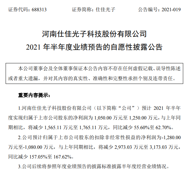 ICC訊 (編輯:Nicole) 河南仕佳光子科技股份有限公司(以下簡稱“仕佳光子”或“公司”)發(fā)布2021 年半年度業(yè)績預(yù)告:預(yù)計2021 年半年度實現(xiàn)歸屬于上市公司股東的凈利潤為 1,050.00 萬元至 1,250.00 萬元,與上年同期相比,將減少 1,565.11 萬元至 1,765.11 萬元,同比減少 55.60%至 62.70%;預(yù)計歸屬于上市公司股東的扣除非經(jīng)常性損益的凈利潤為-1,280.00 萬元至-1,080.00 萬元,與上年同期相比,將減少 2,973.03 萬元至 3,173.03 萬元,同比減少 157.05%至 167.62%。
