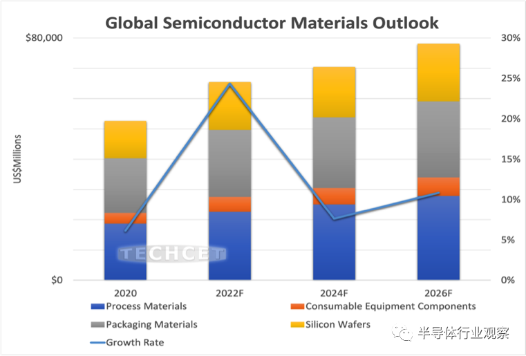 ICC訊 提供戰(zhàn)略商業(yè)和技術(shù)信息的電子材料咨詢公司techct預(yù)測,半導(dǎo)體制造材料在2022年將超過650億美元,比2021年高出8%。TECHCET總裁/首席執(zhí)行官Lita Shon-Roy表示:“今年上半年半導(dǎo)體需求保持強勁,材料的平均銷售價格呈上升趨勢。”由于預(yù)期市場狀況放緩,目前預(yù)計半導(dǎo)體材料市場增長在2023年僅略高于2%,2024年進一步改善。“這與需求和庫存量的周期保持一致,”Shon-Roy說,如下圖所示。