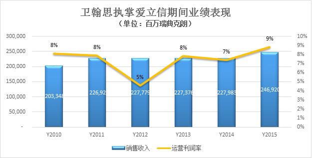 衛(wèi)翰思于2010年1月1日正式就任愛(ài)立信CEO,到2016年為止共發(fā)布過(guò)6次年報(bào),從這6份年報(bào)披露的公司財(cái)務(wù)數(shù)據(jù)來(lái)看,在衛(wèi)翰思執(zhí)掌愛(ài)立信的6年多時(shí)間里,其創(chuàng)造的業(yè)績(jī)實(shí)在是差強(qiáng)人意:銷售收入在6年間僅增長(zhǎng)了20%,且始終在2000億到2500億瑞典克朗(約300億美元)間徘徊,而運(yùn)營(yíng)利潤(rùn)率則一直低于10%?! ?/p>