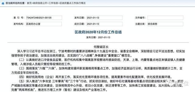 寧波市鎮(zhèn)海區(qū)人民政府發(fā)布的《區(qū)政府2020年12月份工作總結(jié)》提到: