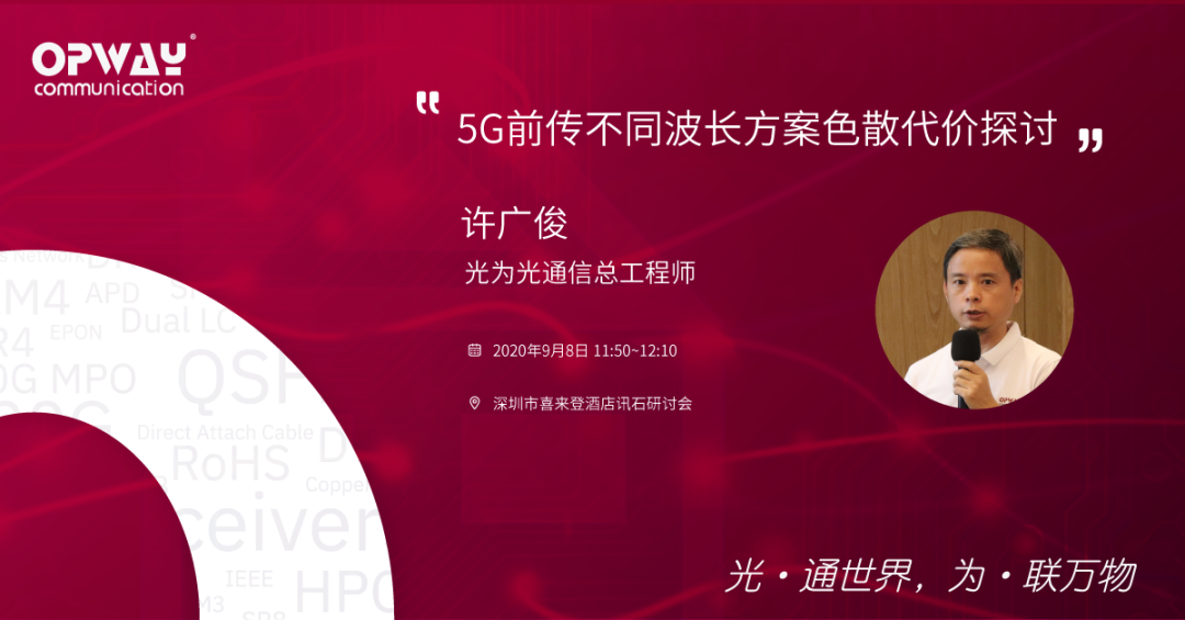 應(yīng)訊石邀請(qǐng),光為副總經(jīng)理兼總工程師許廣俊先生作為本次研討會(huì)的演講嘉賓,將與大家分享《5G前傳不同波長(zhǎng)方案色散代價(jià)探討》,針對(duì)目前5G不同波長(zhǎng)光纖傳輸前傳方式,包括CWDM, LWDM以及MWDM等,基于激光器、光模塊、光纖等的性能,進(jìn)行了相應(yīng)的仿真研究,并結(jié)合相應(yīng)的激光器芯片、光模塊、單模光纖等進(jìn)行了色散代價(jià)等傳輸實(shí)驗(yàn),與仿真結(jié)果進(jìn)行對(duì)比分析,為5G前傳各波長(zhǎng)傳輸方案和不同應(yīng)用場(chǎng)景提供參考,敬請(qǐng)期待!