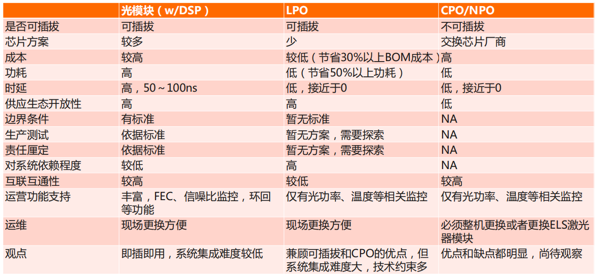 隨著交換機(jī)Serdes速率和數(shù)量的增加,現(xiàn)今,光模塊功耗占設(shè)備總功耗高達(dá)1/3。低功耗、低時(shí)延的光互聯(lián)技術(shù)更適合超算,陸睿對(duì)比了LPO/CPO/NPO技術(shù)的對(duì)比和選擇,他認(rèn)為LPO優(yōu)點(diǎn)是兼顧可插拔和CPO的優(yōu)點(diǎn),但系統(tǒng)集成難度大,技術(shù)約束多。CPO/NPO優(yōu)缺點(diǎn)都很明顯,尚待觀察。