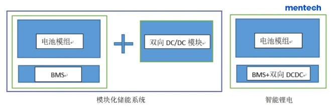 與智能鋰電相比,模塊化儲(chǔ)能系統(tǒng)中把雙向DC/DC變換設(shè)備設(shè)計(jì)成模塊化,每個(gè)模塊能夠滿足不同規(guī)格、多個(gè)相同規(guī)格電池并聯(lián)接入的方式,可以靈活配置電池,使得電池和雙向DC/DC容量的配置與實(shí)際需求更加匹配。采用分開布局,這樣雙向DC/DC模塊的發(fā)熱可以單獨(dú)處理,散熱效率更高。具體架構(gòu)差異如下圖所示:
