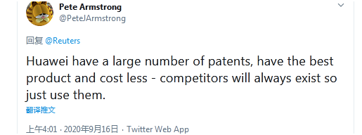 對(duì)于蓬佩奧的說法,有英國網(wǎng)友PeteArmstrong評(píng)論說,“華為擁有大量專利,擁有最好的產(chǎn)品以及很低的成本——競爭對(duì)手總會(huì)一直有,所以只管去用它們。”↓