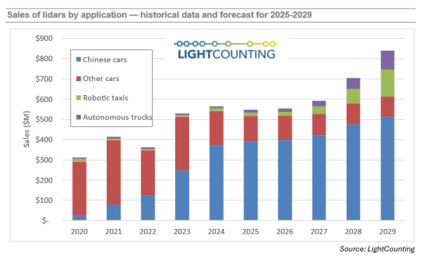 從2022年至2023年,中國汽車制造商開始在其許多車型上部署激光雷達,并擴大了生產(chǎn)規(guī)模。禾賽科技和速騰聚創(chuàng)(領先的激光雷達供應商)現(xiàn)已成為上市公司,它們報告稱過去兩年以及2024年前9個月激光雷達出貨量穩(wěn)步上升。然而,價格急劇下降限制了銷售額的增長。LC預計持續(xù)的價格下跌加上需求穩(wěn)定,將在2025-2026年導致銷售額下降。歐洲和北美汽車制造商對激光雷達購買量的減少將是另一個負面影響市場的因素。該細分市場在下圖中顯示為“其他汽車”。