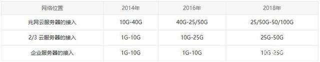 隨著云計(jì)算和5G網(wǎng)絡(luò)興起,數(shù)據(jù)中心趨于更高速率發(fā)展,因此,布局在數(shù)據(jù)中心不同位置的網(wǎng)絡(luò)設(shè)備必須適應(yīng)變化,向更高速率升級(jí)。下表為歷年來(lái)服務(wù)器接入交換機(jī)的傳輸速率演變情況,企業(yè)服務(wù)器的接入從1G-10G向10G-25G發(fā)生轉(zhuǎn)變,大型云服務(wù)器的接入從10G-40G向25/50G-50/100G發(fā)生轉(zhuǎn)變。