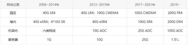 由于服務(wù)器、交換機(jī)等網(wǎng)絡(luò)設(shè)備趨于更高速率、更高性能的發(fā)展,光模塊也必將隨之發(fā)生轉(zhuǎn)變,這樣才能確保整個(gè)網(wǎng)絡(luò)的性能。下表為歷年來(lái)數(shù)據(jù)中心中各個(gè)位置網(wǎng)絡(luò)部署情況,從表格中我們可以看出,數(shù)據(jù)中心園區(qū)正在從40G向100G甚至更高速率發(fā)生轉(zhuǎn)變,如今,100G光模塊風(fēng)頭正盛。(說(shuō)明:表格中不同類型的光模塊旨在用于不同傳輸距離和應(yīng)用環(huán)境的信號(hào)傳輸,如,40G LR4用于傳輸距離為10千米的鏈路,100G CWDM4用于傳輸距離為2千米的鏈路。)