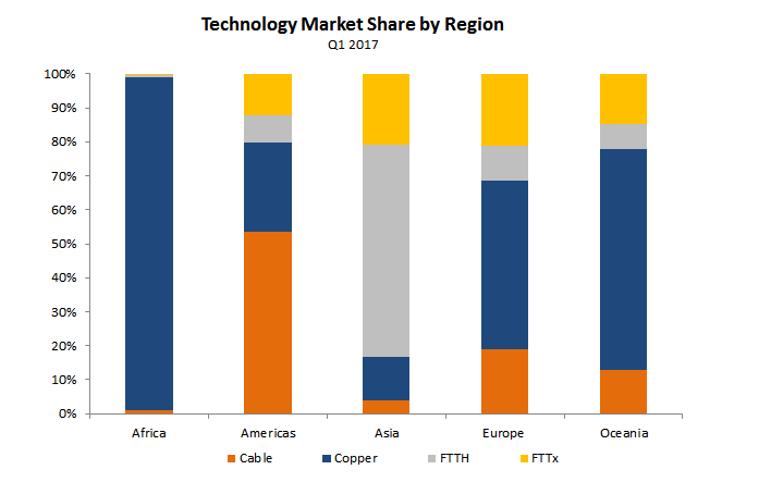 . 2017第一季度,銅線繼續(xù)下跌,但下跌速度比上季度放緩,由于FTTH和VDSL的增長,銅線的下跌在歐洲和大洋洲表現(xiàn)的尤為明顯,銅線的份額下降了2.1%。
