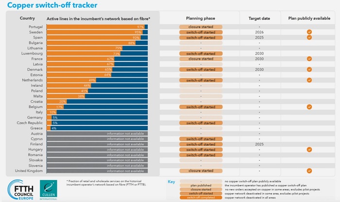 如同歐洲的許多事情一樣,淘汰銅線的過(guò)程在不同國(guó)家以不同的速度進(jìn)行。雖然有些國(guó)家走在前面,但許多歐洲運(yùn)營(yíng)商在徹底淘汰最后一根銅線之前仍有很長(zhǎng)的路要走。
