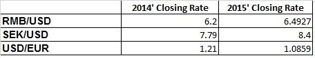 解讀之前需要說明的是,五家通信廠商總部分處不同國家,因此財報數(shù)據(jù)所用貨幣單位也各不相同:華為和中興采用人民幣,愛立信采用瑞典克朗,諾基亞和阿朗采用歐元。為便于比較,按照各廠家財報里使用的如下年終記賬匯率統(tǒng)一折算為第三方貨幣,以美元來核算。但由于2015年美元相對于人民幣、瑞典克朗和歐元的升值幅度不一致,所以幣值的轉(zhuǎn)換會對數(shù)字結(jié)果造成一定的影響,在具體分析中會予以說明: