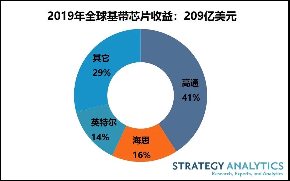 Strategy Analytics這份研究報告指出,高通、海思、英特爾、聯(lián)發(fā)科和三星LSI在2019年占據(jù)了全球蜂窩基帶處理器市場前五名的收益份額。高通以41%的收益份額領先,其次是海思16%,英特爾占14%。