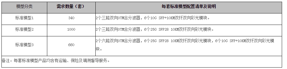 根據(jù)此前招標公告顯示,該項目為集中招標項目,預估含稅總金額為11,426,560元,擬采購無源光纖復用設備的3個標準模型見下表: